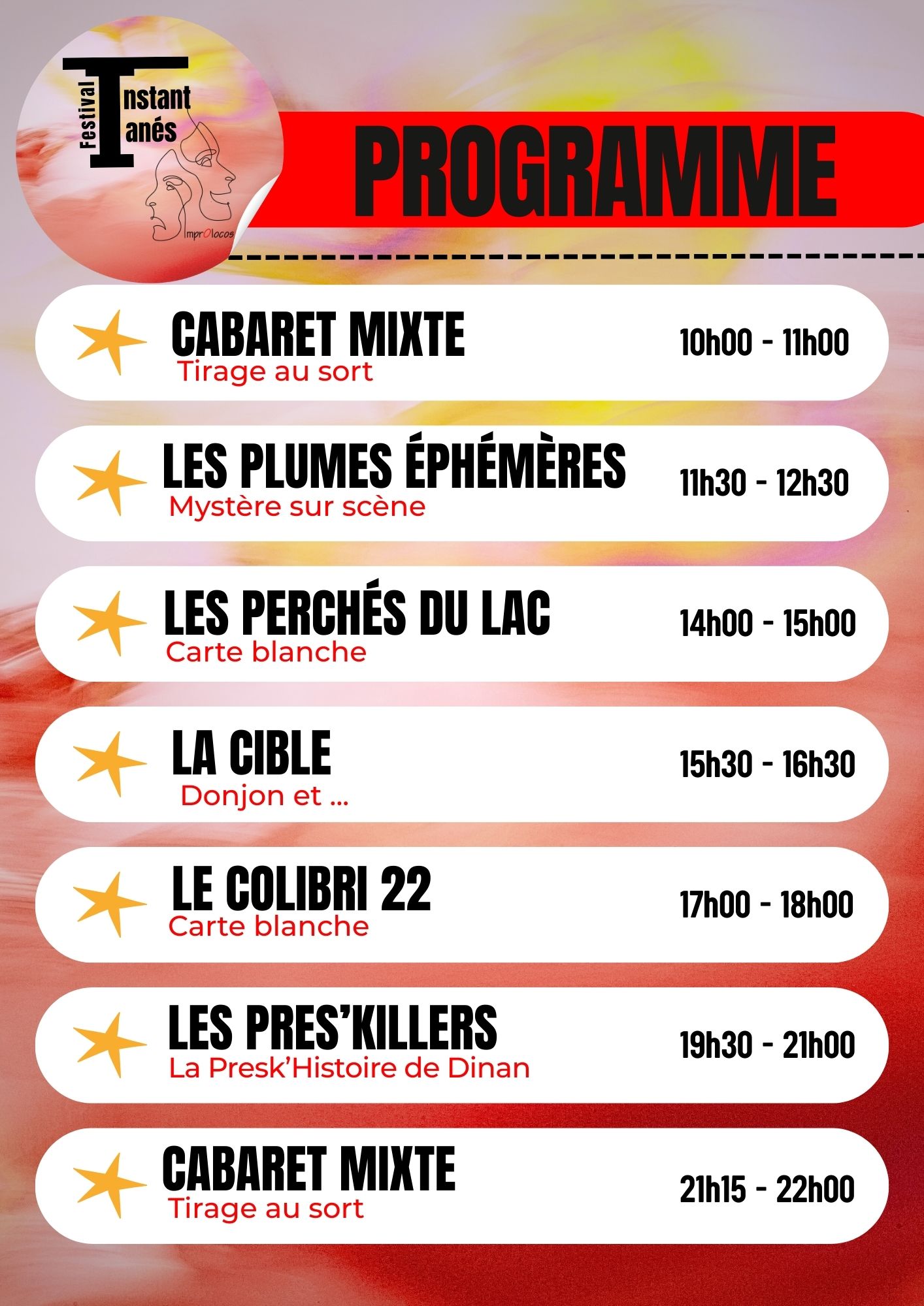 Festival Les InstanTanés 1 ère édition La troupe des Improlocos organise sa première édition du festival « Les InstanTanés » le Samedi 4 avril 2026 De 10h00 à 22h00 7 spectacles Une journée d'improvisation Des troupes hors norme Programmation du festival ICI Retrouvez les troupes invitées sur leurs réseaux : La cible Colibri 22 Les Pres Killers Les Plumes Éphémères Les Perchés du Lac